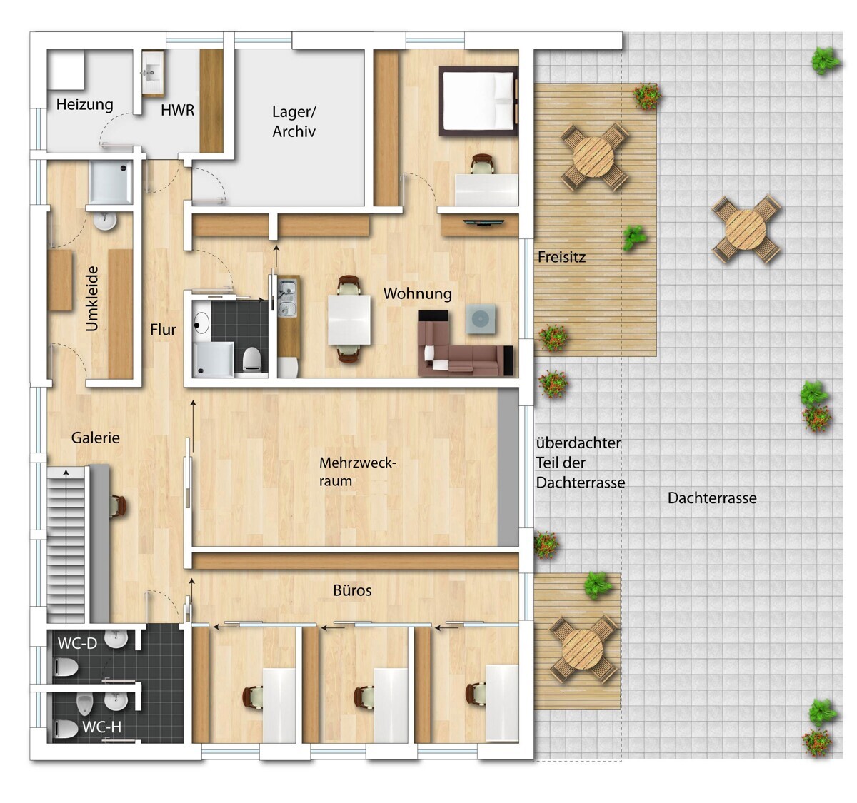 Das OG beheimatet neben 3 Nachbearbeitungsbüros und einem Vortragsraum auch die notwendigen Sozialräume, die Haustechnik und eine Einliegerwohnung mit Duschbad, Küche, Schlafraum und einer schönen Dachterrasse.